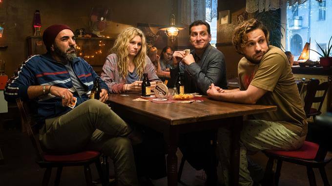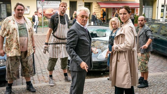 Doch dann droht die einzigartige Kreuzberg-WG sowie die Idylle des Kiezes aufgrund eines gigantischen Bauprojekts zerstört zu werden. Hinter dem Projekt stecken der rechtspopulistische Immobilienhai Jörg Dwigs (Henry Hübchen, vorne links) und dessen skrupellose Geliebte (Bettina Lamprecht, vorne rechts).