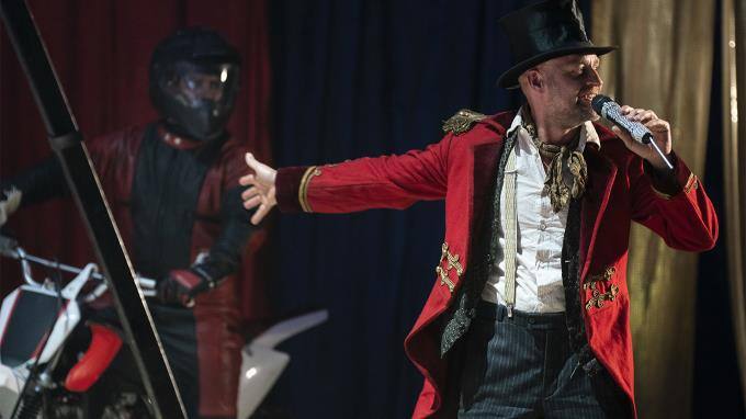Während der Show stellt Zirkusdirekter Matanola (Jürgen Vogel) seinen Sohn Steve (Max Hubacher) vor, ...