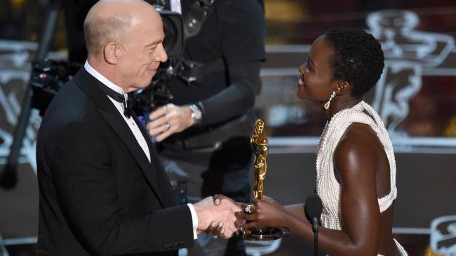 Der erste Gewinner des Abends ist J.K. Simmons für "Whiplash" als Bester Nebendarsteller. Lupita Nyong'o überreicht die Statue im glänzenden Perlendress.