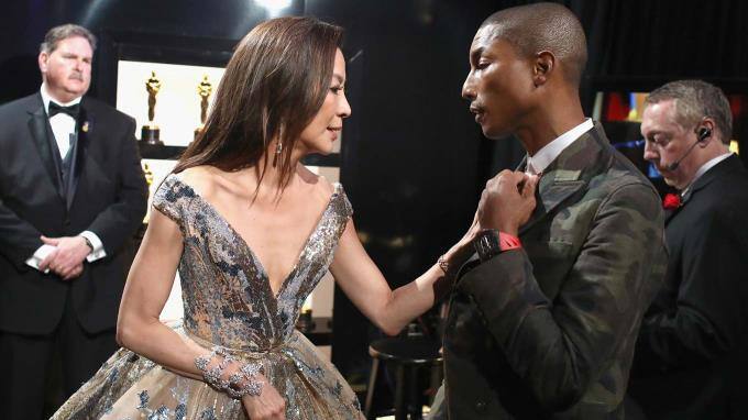 "Du hast da noch einen Fussel." Schauspielerin Michelle Yeoh achtet darauf, dass ihr Laudator-Partner, Sänger Pharrell Williams, gut aussieht.