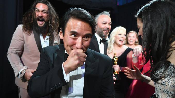Jimmy Chin freut sich über seinen Award in der Kategorie "Bester Dokumentarfilm" für "Free Solo" und auch "Aquaman"-Star Jason Momoa hat backstage jede Menge Spaß.