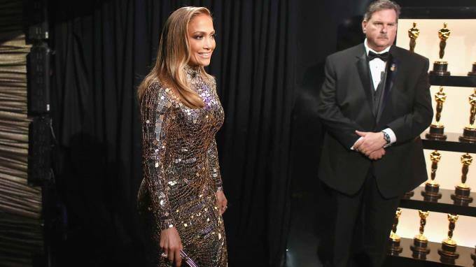 Sängerin Jennifer Lopez strahlt mit den Oscars® im Hintergrund um die Wette.