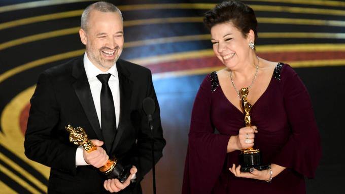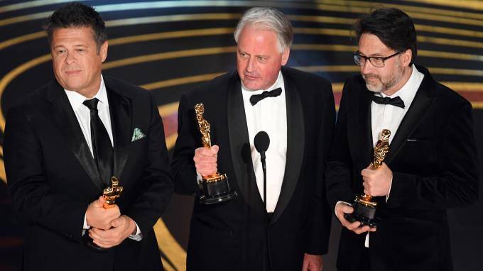 Der erste Oscar® für "Bohemian Rhapsody" für den "Besten Tonschnitt": John Warhurst und Nina Hartstone