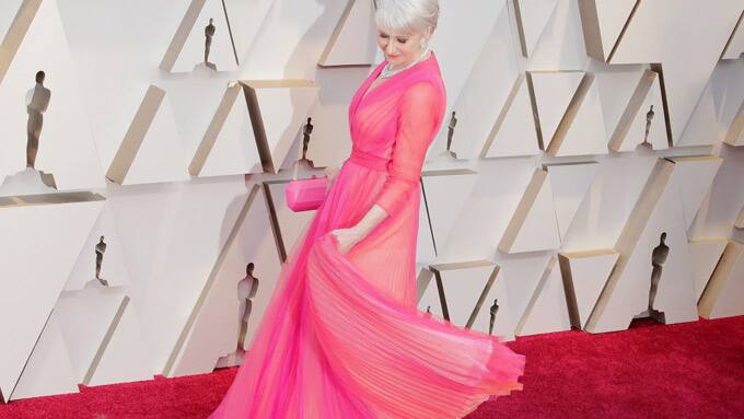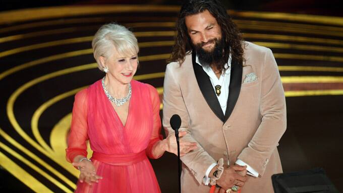 Haben ihr Outfit für den Abend zwar nicht absichtlich abgestimmt, aber beide können pink tragen und sehen richtig gut darin aus: "The Queen" Helen Mirren und "Aquaman" Jason Momoa.