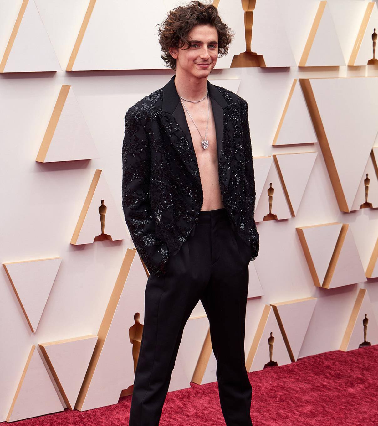 Timothée Chalamet schrieb 2022 auf dem roten Teppich zur 94. Oscar-Verleihung "Fashion-Geschichte". Der "Dune"-Star traute sich als erster Mann, es bei den Academy Awards den Frauen gleichzutun und Haut zu zeigen, indem er einfach auf ein Hemd verzichtete. Seinen nackten Oberkörper bedeckten lediglich eine kurze Luis-Vuitton Jacke und Schmuck von Cartier.
