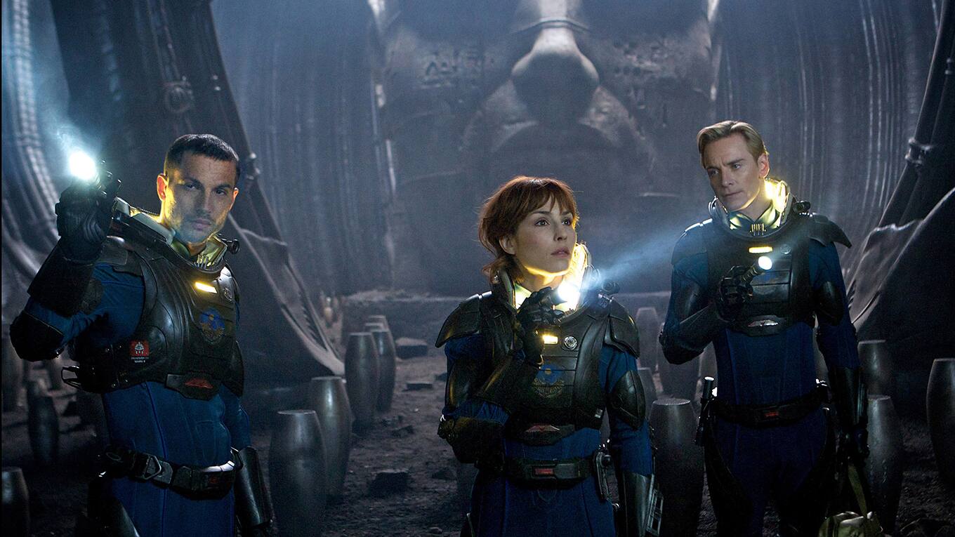Das Archäologenpaar Elizabeth Shaw und Charlie Holloway (Noomi Rapace, Logan Marshall-Green) entdeckt im Jahr 2089 auf der Insel Skye prähistorische Wandmalereien. Eine riesige Gestalt scheint darauf Menschen zu einer Reise ins Weltall einzuladen. Im Auftrag von Weyland Industries machen sie sich mit einem Erkundungstrupp auf die Reise zum fernen Mond LV-223. In Vertretung des greisen Sir Peter Weyland hat Meredith Vickers (Charlize Theron) das Kommando. Mit an Bord des Schiffes von Captain Janek (Idris Elba) ist neben Wissenschaftlern auch der Androide David (Michael Fassbender), der die zwei Jahre dauernde Reise nicht im Kälteschlaf, sondern mit dem Studium der indogermanischen Ursprache verbringt. Auf LV-223 entdecken sie gewaltige Bauwerke, in deren Tunnelsystem seltsame Holografien von riesigen Wesen auf sie warten. Sind das die Konstrukteure, die einst die Menschen erschaffen haben? Als es zwei Wissenschaftler nicht mehr aus dem Bauwerk schaffen und die Nacht in einer der riesigen Hallen verbringen, werden sie von einer seltsamen Kreatur angegriffen.