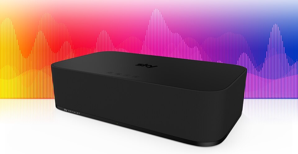 Schwarzes Sky-Gerät mit Logo oben, vor farbigem Hintergrund mit Wellen in Rot, Orange, Pink, Lila und Blau.