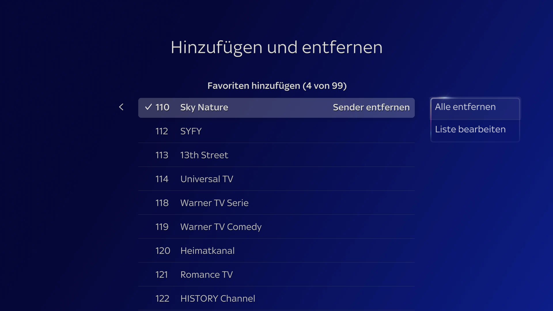 Die Zuordnung der Sender zur Favoritenliste (Häkchen vor dem Sendernamen) kannst du einzeln durch erneutes Bestätigen der Taste OK oder gesamt durch Alle entfernen rückgängig machen.