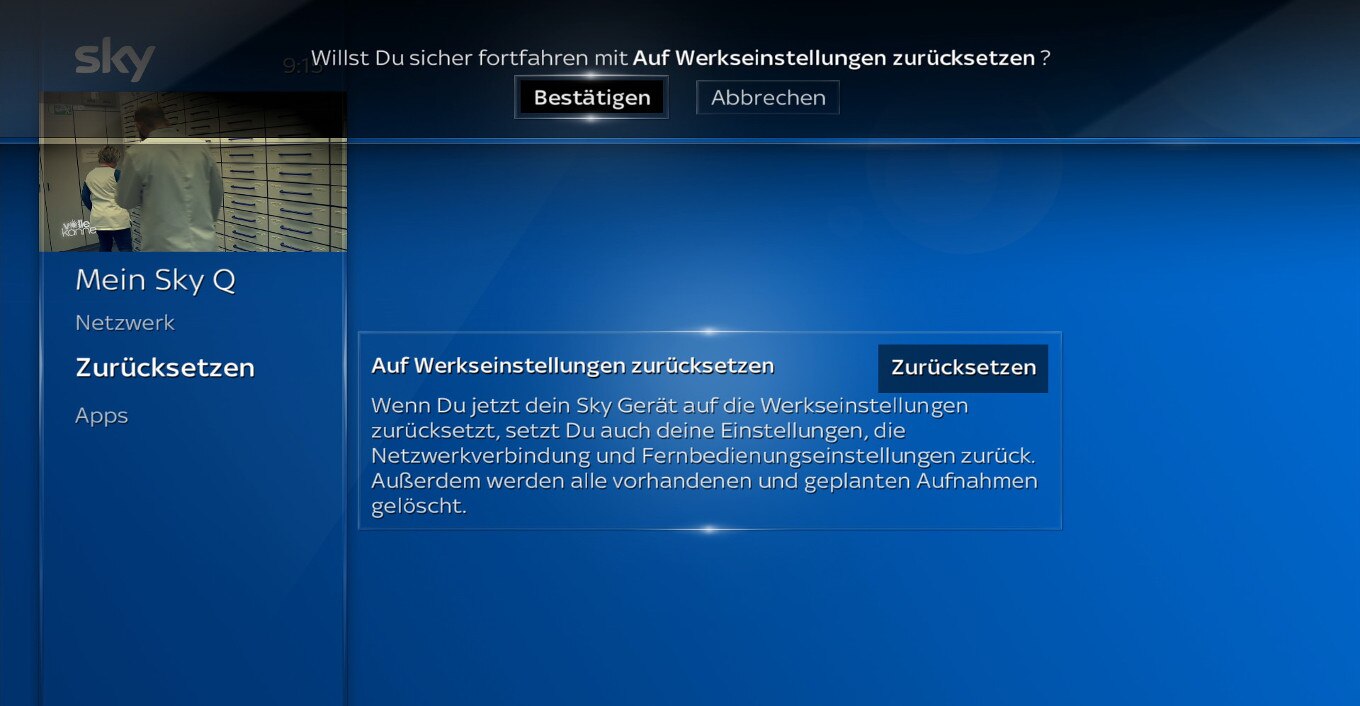 Sky Q-Bildschirm mit Reset-Hinweis, zum Zurücksetzen und Bestätigen von 'Zurücksetzen auf Werkseinstellungen'.