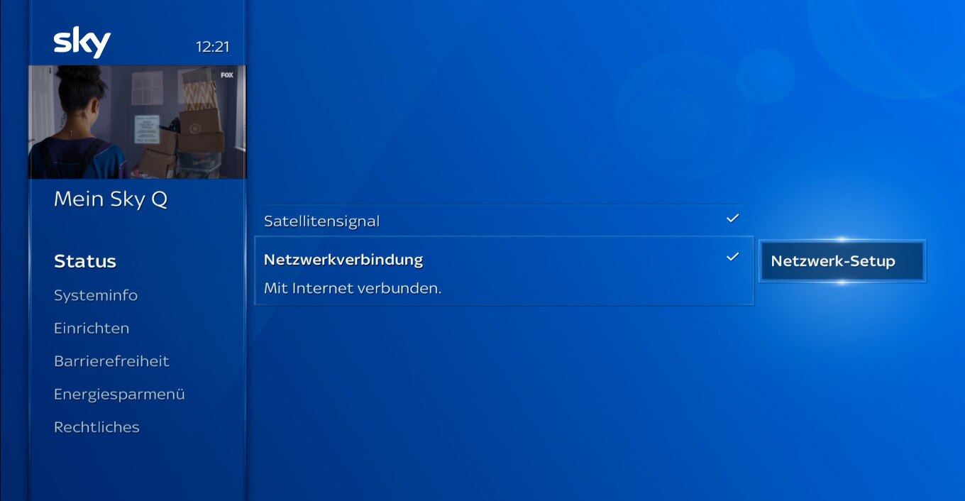 Drücke die Taste Home auf der Sky Q Fernbedienung und navigiere zu Mein Sky Q > Einstellungen > Status. Dort wähle den Punkt Netzwerkverbindung an und dann rechts den Punkt Netzwerk-Setup aus.