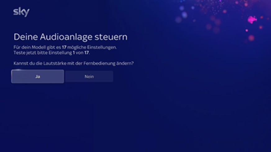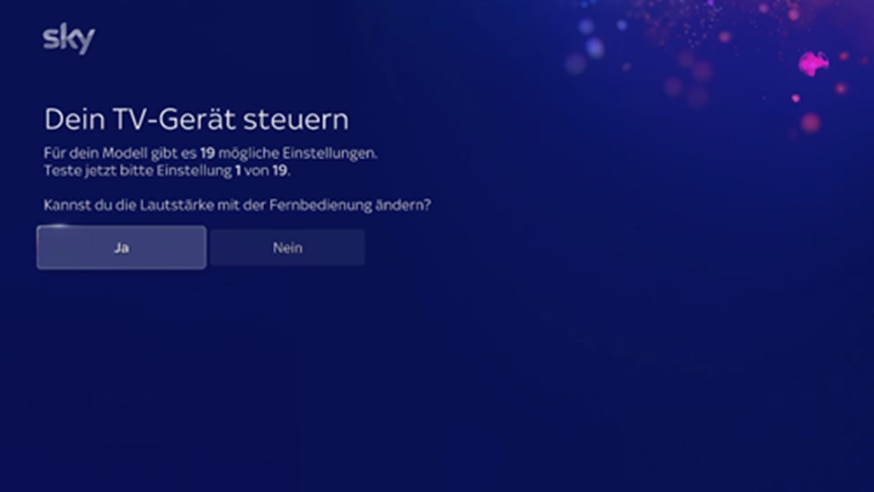 2. Prüfe, ob du die Lautstärke deines Fernsehers mit der Sky Stream Fernbedienung steuern kannst, und bestätige mit Ja oder Nein