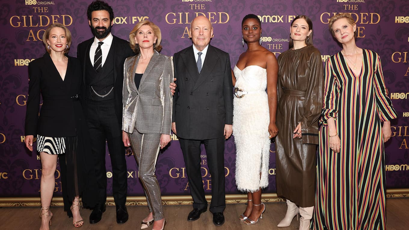 Die erste Staffel von "The Gilded Age" erschien 2022 (v.l.): Carrie Coon, Morgan Spector, Christine Baranski, Julian Fellowes, Denee Benton, Louisa Jacobson, Cynthia Nixon