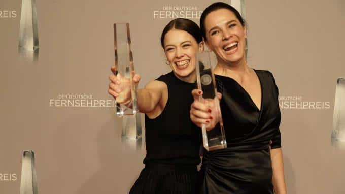 Die Schauspielerinnen Paula Beer (links) und Desiree Nosbusch freuten sich, dass "Bad Banks" als beste Dramaserie geehrt wurde.