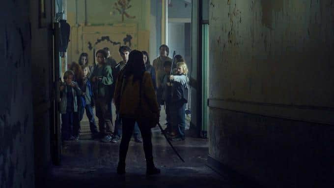 Linus (Luke David Blumm), Mitchell (Joey Simon), Gina (Jessi Goei), Winnie (Elle Graham) und die anderen Kinder greifen Michonne an.