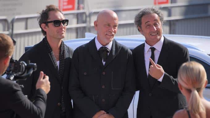 Die Hauptdarsteller Jude Law (l.) und John Malkovich (m.) mit Regisseur Paolo Sorrentino (r.) kamen gut gelaunt zur Premiere von "The New Pope" auf das Filmfestival in Venedig.