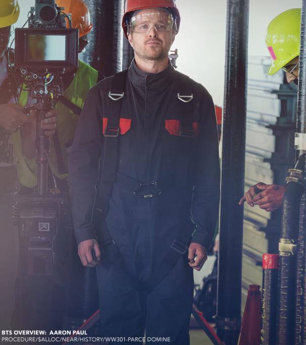 Aaron Paul als Caleb und Stuntman, der Roboter George spielt.