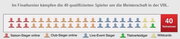 Club-Sieger online: Aus jedem Bundesliga-Club qualifiziert sich am Ende der Saison jeweils der Führende der Vereins-Rangliste für das Finalturnier. Wenn besagter Spieler bereits über die Gesamt-Rangliste qualifiziert ist, rückt der zweitbeste Spieler nach.