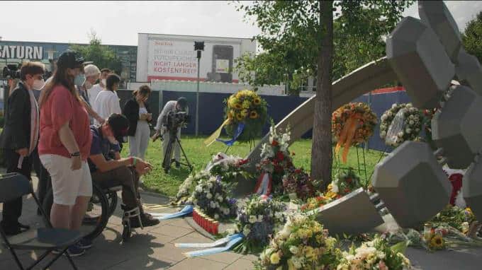 Die Sky Original True-Crime Dokureihe "22. Juli - Die Schüsse von München" beleuchtet die Hintergründe und Motive des Münchner OEZ-Attentats. Bild: Trauernde bei der Gedenkfeier 2021.