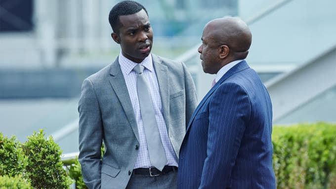 Ed Dumani (Lucian Msamati, rechts) verrät seinem Sohn Alex (Paapa Essiedu), dass die Investoren die Anschlägen auf den Wallace-Clan beauftragt haben.