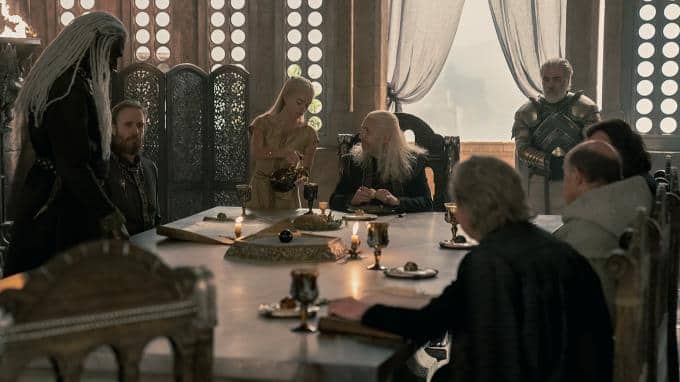 Rhaenyra arbeitet für ihren Vater bei den Ratssitzungen als Mundschenk. Neben Otto Hohenturm gehören auch Lord Lyman Bienengraben (Bill Paterson) als Meister der Münze und Lord Corlys Velaryon (Steve Toussaint) zum Rat. Corlys ist mit Rhaenys Targaryen verheiratet und ein herausragender Seefahrer, weshalb er auch "die Seeschlange" genannt wird.