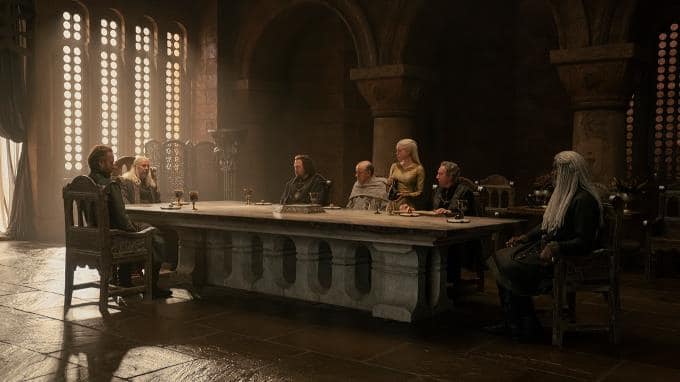 König Viserys (Paddy Considine) hält eine Sitzung des Kleinen Rats ab, bei dem seine Tochter und Thronfolgerin Rhaenyra (Milly Alcock) als Mundschenk die Männer bedient.