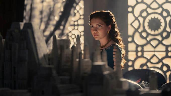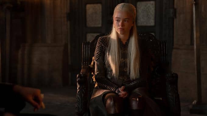 Prinzessin Rhaenyra (Milly Alcock) wirft ungefragt ein, dass der König mit seinen Drachenreitern eingreifen könne. Er würde so Macht demonstrieren. Viserys wiegelt ihren Plan allerdings ab.
