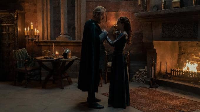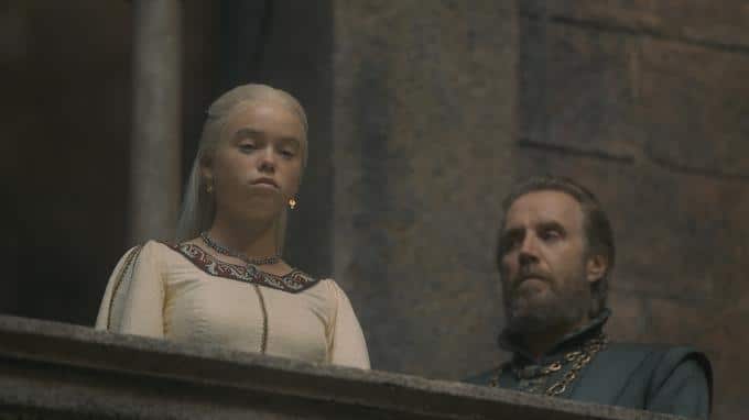 Unterdessen genießt König Viserys die Unterhaltung mit Ottos Tochter Alicent Hohenturm (Emily Carey). Er gesteht ihr, dass er in dem halben Jahr, nachdem seine Frau verstarb, kaum mit seiner Tochter Rhaenyra geredet habe und sich nun Sorgen um sie mache. Alicent rät ihm, dass er auf sie zugehen solle.