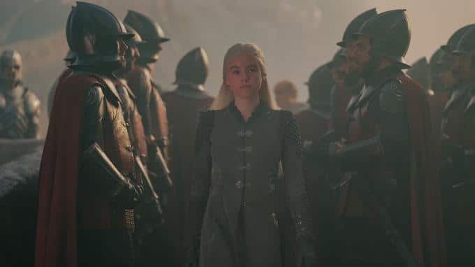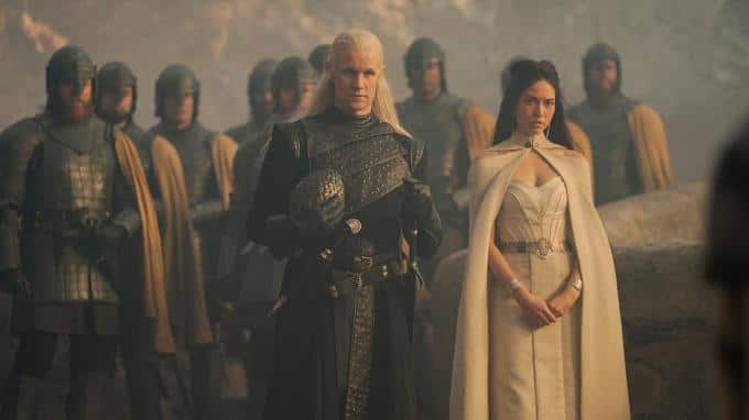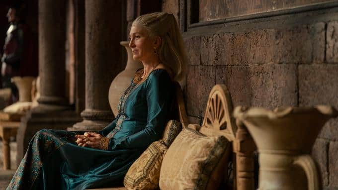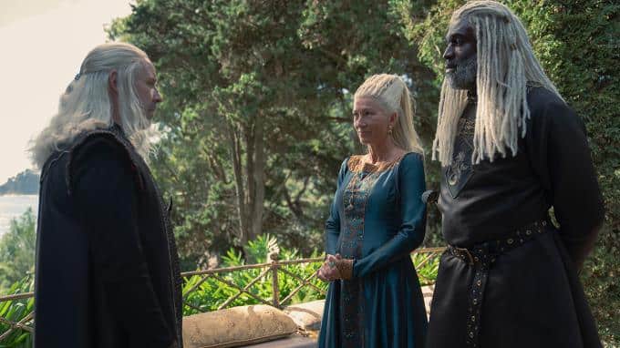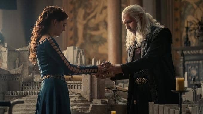 Der König wird zunehmend gedrängt, sich eine neue Frau zu suchen, um für weitere Nachkommen zu sorgen. Seine Cousine Rhaenys (Eve Best) und ihr Mann Corlys unterbreiten dem König den Vorschlag, ihre Tochter Laena zu heiraten. Damit können sie ihre beiden bedeutenden valyrischen Häuser vereinen und Stärke demonstrieren.