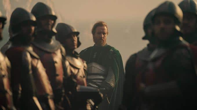 Otto Hohenturm (Rhys Ifans) verabschiedet sich von seiner Tochter Alicent, weil er mit einigen Soldaten nach Drachenstein reisen muss.