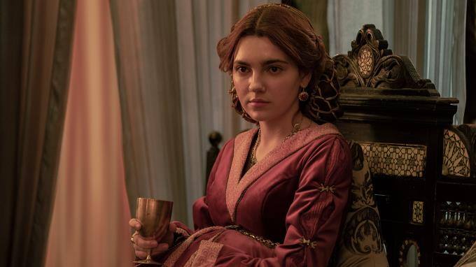 Alicent (Emily Carey) stärkt ihrer ehemals besten Freundin während des Gesprächs den Rücken. Das Verhältnis zu Rhaenyra hat sich seit der Hochzeit mit Viserys allerdings sehr verschlechtert. Alicent ist zudem mit dem zweiten Kind des Königs schwanger.