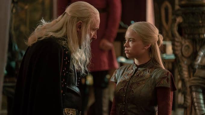 Den engen Kontakt zu seiner Tochter Rhaenyra (Milly Alcock) hat Viserys seitdem verloren. Die Prinzessin glaubt, dass ihr Vater sie nun als Thronfolgerin absetzen und dafür ihren kleinen Bruder Aegon ernennen wird.