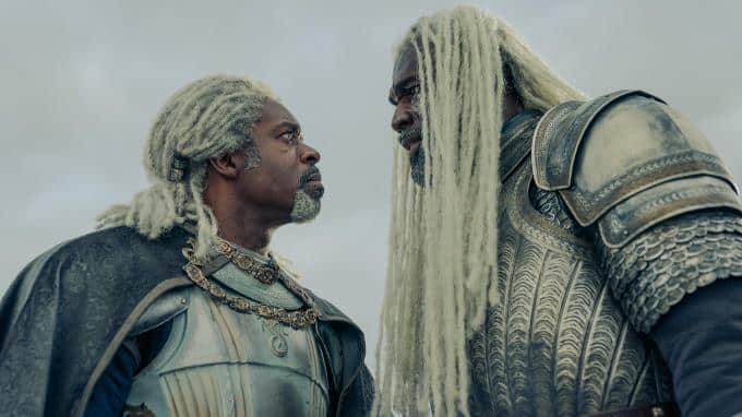Die angespannte Lage führt auch bei den Brüdern Corlys "die Seeschlange" (Steve Toussaint) und Ser Vaemond Valeryon (Wil Johnson, links) zu Streitigkeiten. Vaemond hatte den König eigenmächtig um Hilfe gebeten.