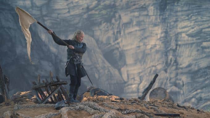 Bevor die Feinde Daemon töten können, fliegt Laenor Velaryon (Theo Nate) auf seinem Drachen Seerauch über das Feld und setzt die Piraten in Flammen.