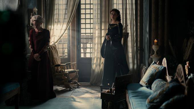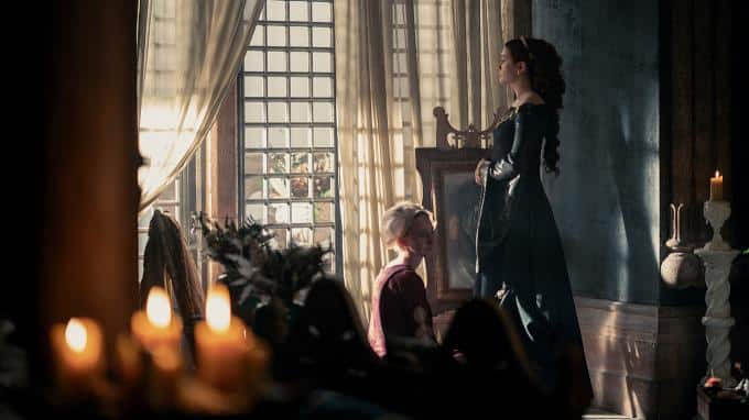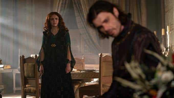 Die Königin ist überrascht, auch Rhaenyra zu sehen, doch die Prinzessin will vor Alicent keine Schwäche zeigen.