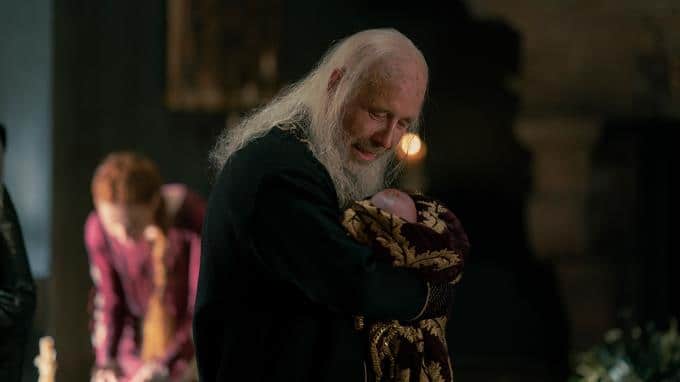 Viserys lässt es sich nicht nehmen, das Neugeborene in seinen Armen zu halten.