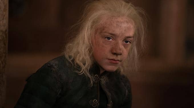 Alicents erstgeborener Sohn Aegon (Ty Tennant) sowie Rhaenrys Söhne nutzen jede Gelegenheit, um sich über Alicents zweitgeborenen Sohn Aemond (Leo Ashton) lustig zu machen, weil dieser noch keinen eigenen Drachen besitzt. König Viserys und Alicent haben neben Aegon und Aemond noch ein drittes Kind, Tochter Helaena Targaryen (Evie Allen).