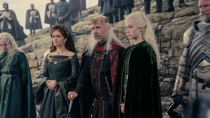 Auch König Viserys (Paddy Considine) ist mit seiner Frau Alicent (Olivia Cooke) und seinen Kindern Aegon (Ty Tennant), Halaena (Evie Allen) und Aemond angereist.