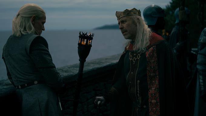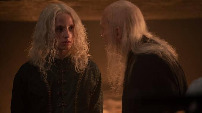 Der König befragt Aemond, von wem er diese Verleumdung gehört habe. Anstatt seine Mutter zu verraten, beschuldigt er seinen Bruder Aegon (Ty Tennant). Als Viserys Aegon zur Rede stellt, entgegnet der nur, dass doch alle wüssten, dass Rhaenyras Kinder nicht von Laenor sind.
