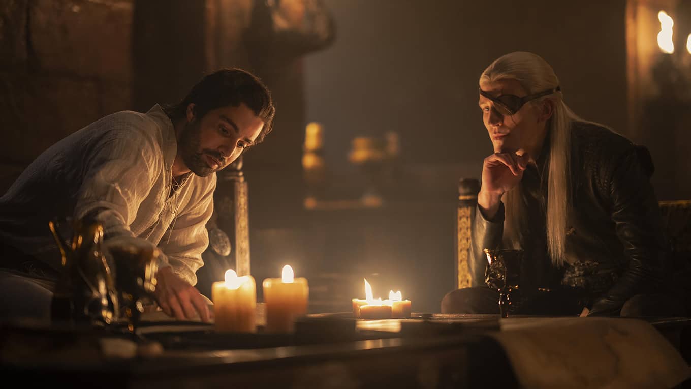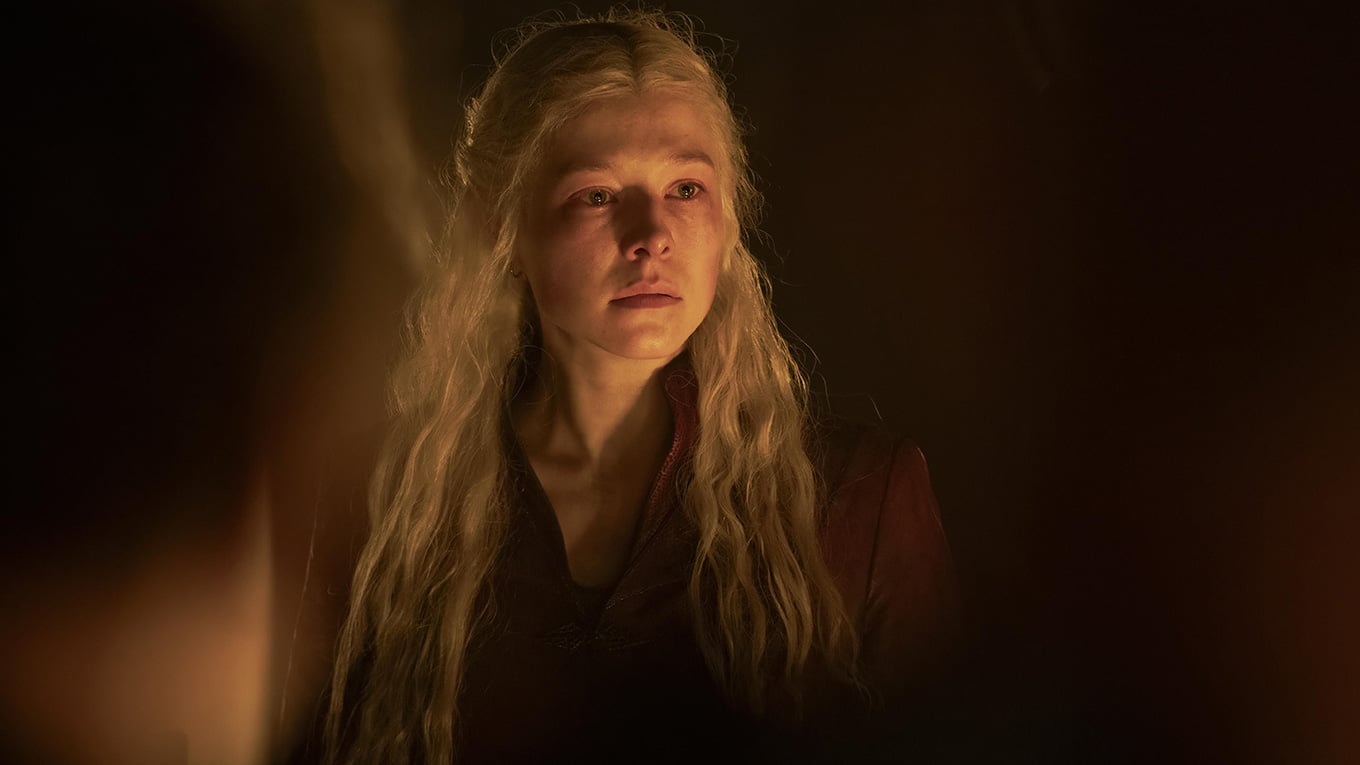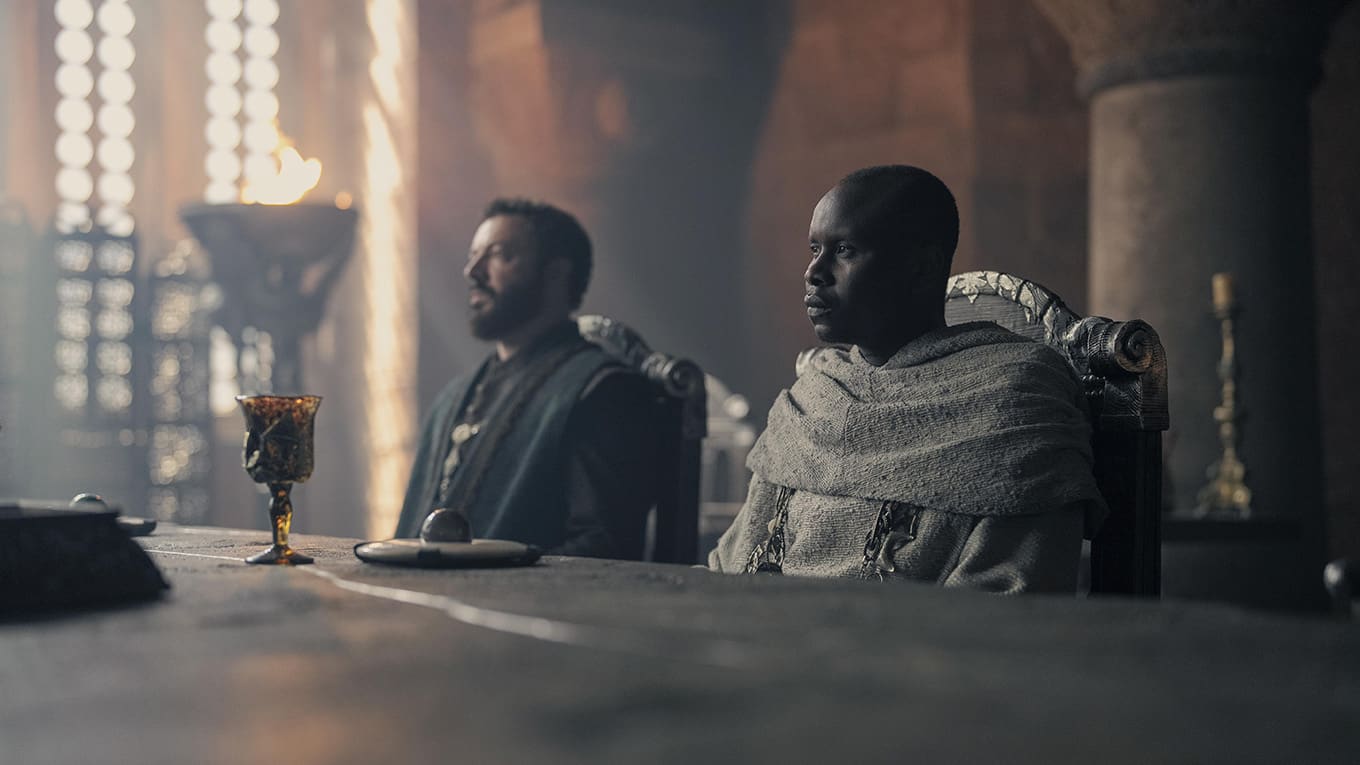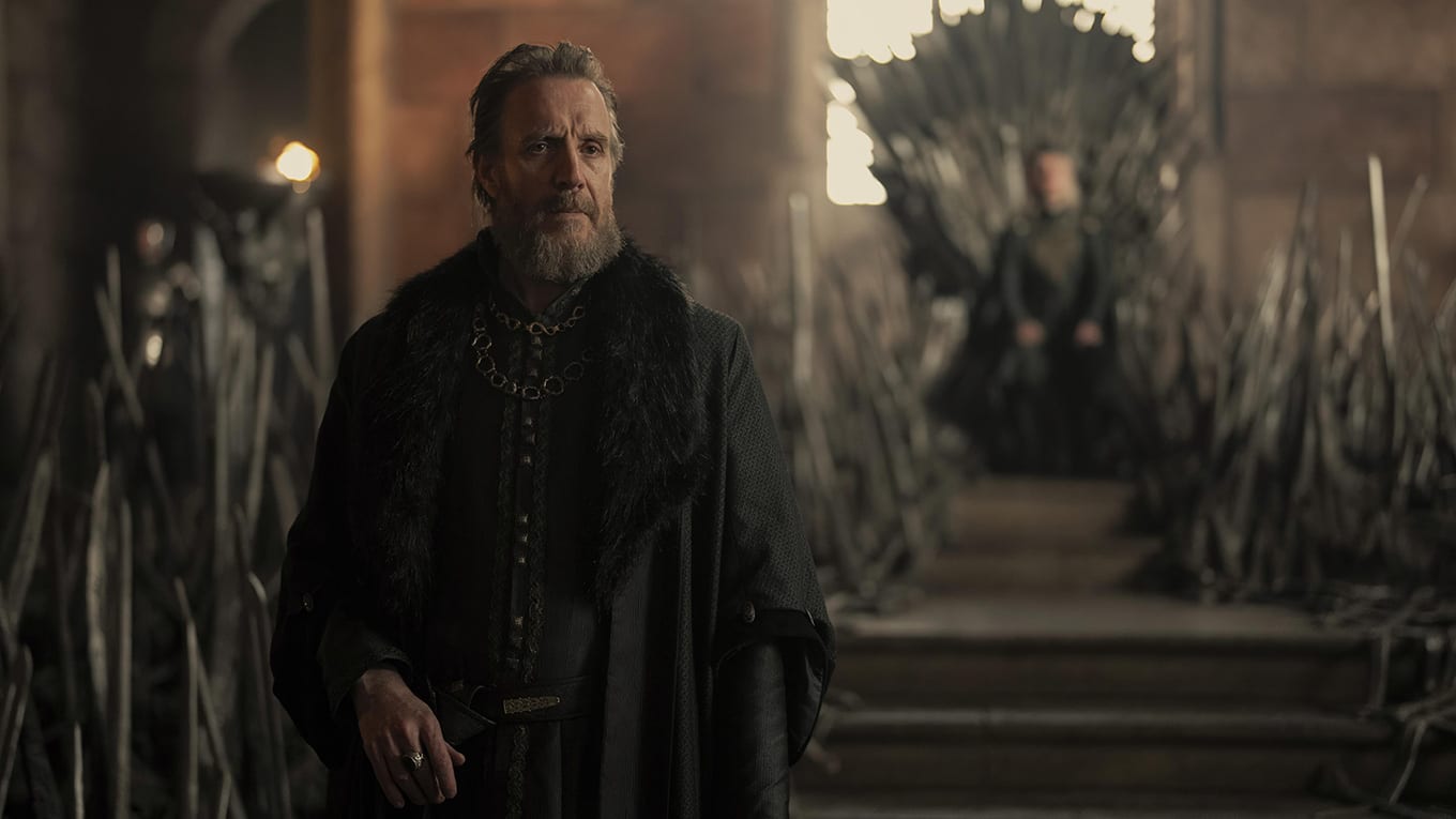Unterdessen patrouilliert Rhaenys Velaryon (Eve Best) auf ihrem Drachen Meleys den Seeweg, um die Blockade aufrechtzuerhalten. Ihr Mann Lord Corlys (Steve Toussaint) befehligt derweil seine mächtige Schiffsflotte, um den Handelsweg nach Königsmund abzuschneiden.