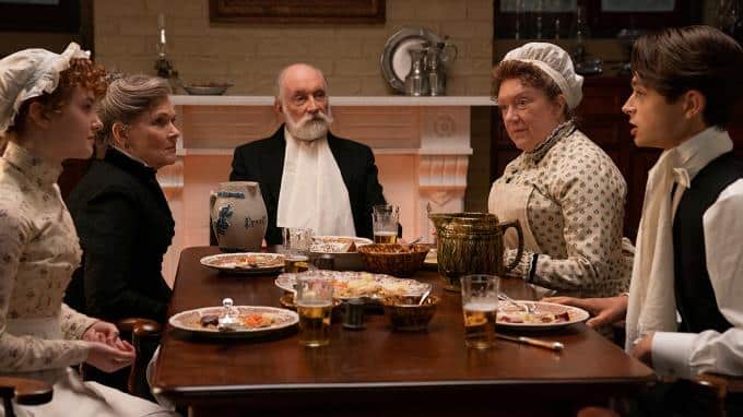 Die zweite Staffel der HBO-Serie spielt 1883 im sogenannten "Vergoldeten Zeitalter" in New York. Mrs. Astor (Donna Murphy, auf dem Sofa rechts) spielt eine bedeutende Rolle in der New Yorker Gesellschaft und entscheide, wer in die High Society aufgenommen wird.