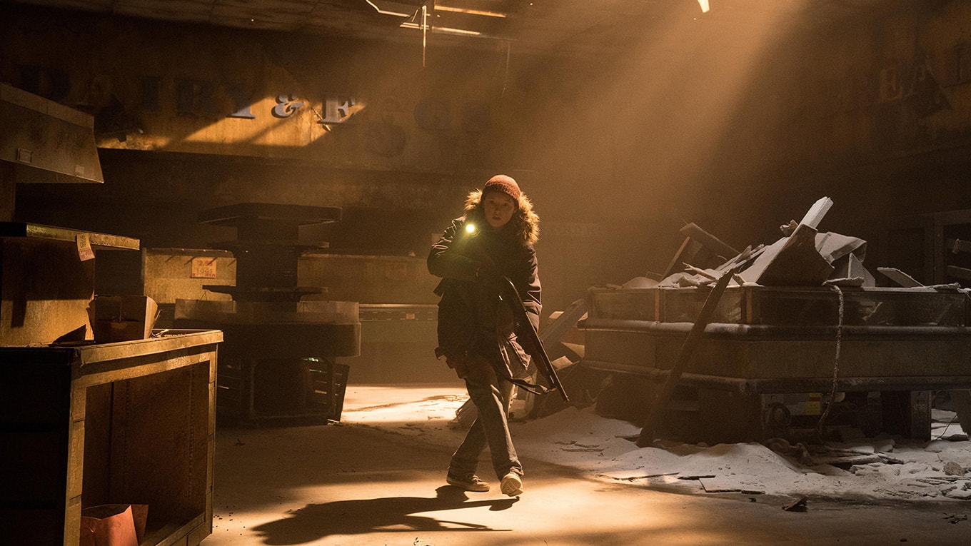 • Die Spur führt zu einem verlassenen Supermarkt, in dem die beiden jungen Frauen zwei Clicker töten. Doch dann stürzt Ellie (Bella Ramsey) plötzlich durch den Boden in einen darunter liegenden Raum.