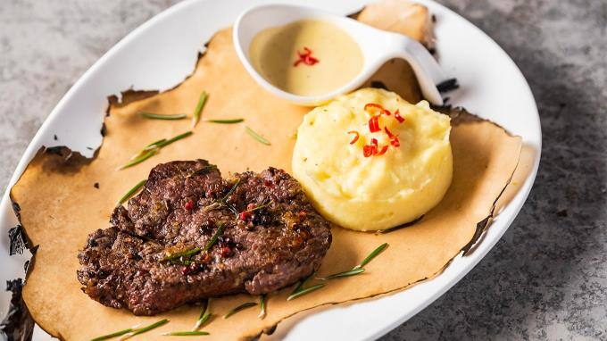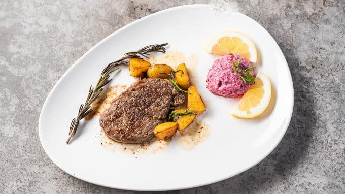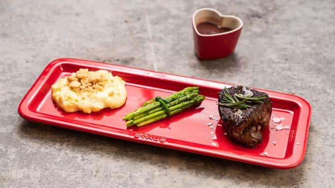Cheyenne zeigt sich im Pressure-Test risikofreudig und kocht Rinderfilet mit Minispargel und Spekulatius-Kartoffel-Püree (Bild). Paula setzt hingegen auf Hühnchen mit Gemüse und Minzjoghurt, während Thomas mit einem Rote-Beete-Risotto mit Ziegenkäse und Cashewnüssen überzeugen will.