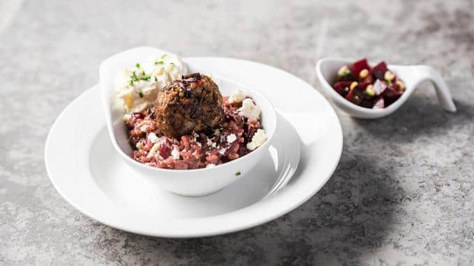... ebenso wie Jochen mit seinen Lammfrikadellen mit Rote-Beete-Risotto (Bild) sowie Jimi mit seinem Steak Bernaise mit graniertem Kartoffelpüree.