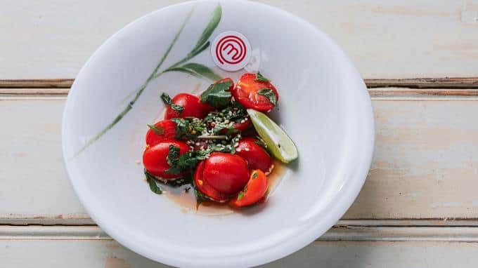 Zur Vorspeise gibt es von Team Rot "Asiatischer Tomatensalat mit Koriander und Thai Basilikum".