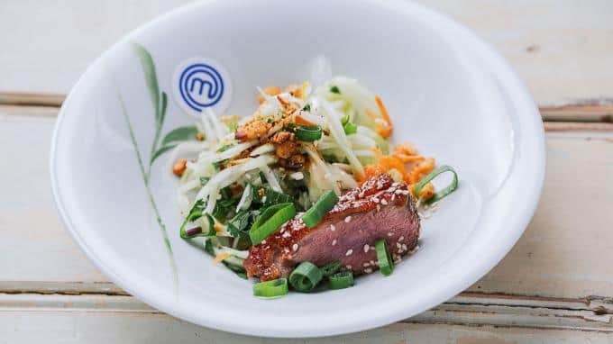 Dann muss auch schon die Vorspeise raus. Von Team Rot gibt es "Asiatischer Tomatensalat mit Koriander und Thai Basilikum" und von Team Blau "Limetten Papayasalat mit glasierter Entenbrust". Jury und Gäste sind etwas mehr von dem blauen Teller überzeugt, vor allem, da die Vorspeise von Team Rot zu einfach war.