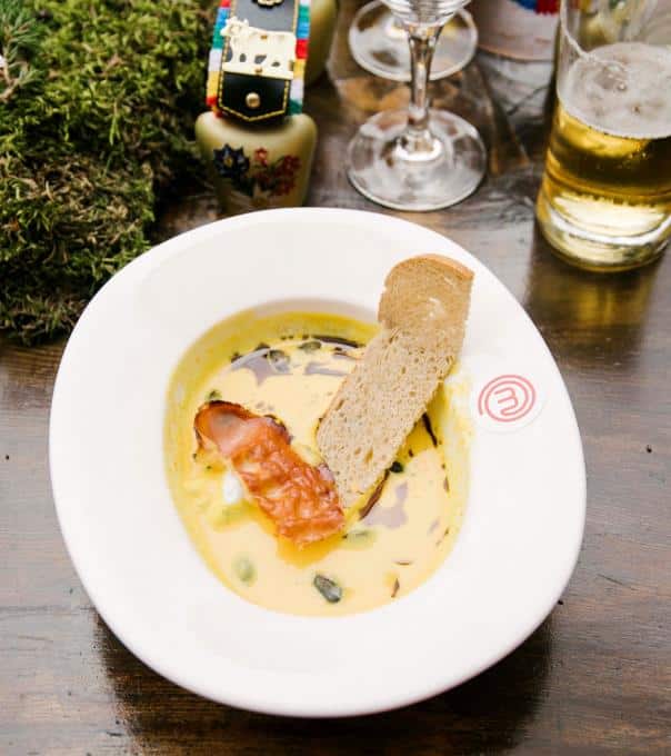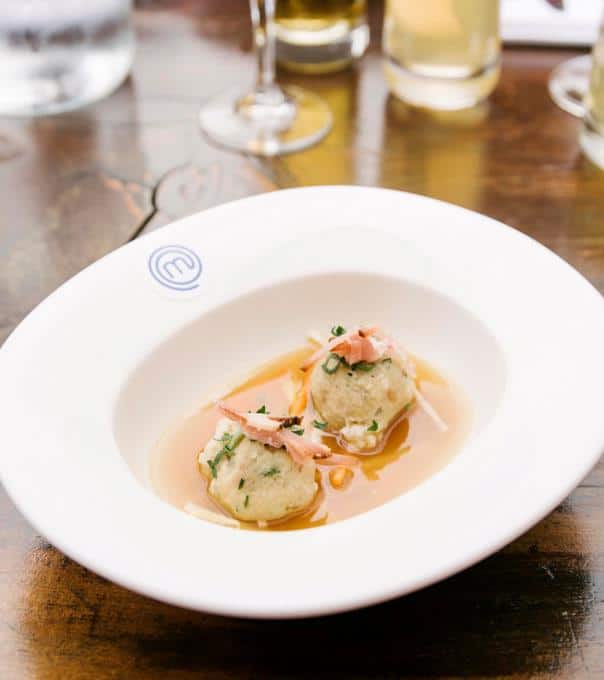 Team Blau hat sich für eine kräftige Rinder-Bouillon mit Speckknödel entschieden.