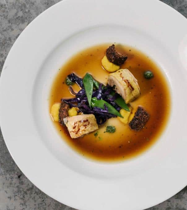 Ballottine mit Kartoffelpüree und geröstetem Schweinebauch.