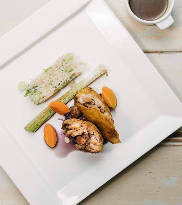Schweinebauch im Hühnermantel auf Rotkohl-Bett mit gebratenem Reis.