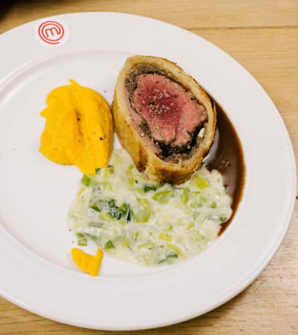 Das Beef Wellington von Team Rot mit Karottencreme und Lauchgemüse.