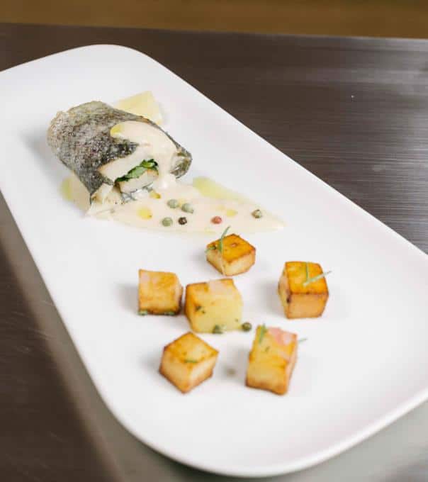 Verónicas gerolltes Forellenfilet mit Mandel-Knoblauch-Spinatfüllung.